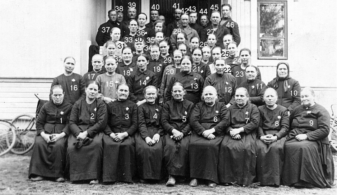 1 = Amanda Saarimaa (Jalmarin äiti), 2 = Susanna Kotala (Heikin vmo. isoisäni Jussin äiti), 3 = Maria Välimäki (Impin ja Kaisan äiti), 4 = Sanna Latvala ('Lehdon isu'), 5 = Sanna-Maija Hietaranta, 6 = Fiia Välimäki (Kustaan vmo), 7 = Miina Murtomäki (Esan vmo), 8 = ?, 9 = ? Takala (mm. Santerin ja Kustaan äiti), 10 = Vilhelmiina Järvenpää (os. Aho, Aukustin ja Laurin äiti), 11 = Anna Murtomäki ('isä-Kaapoon' vmo), 12 = Kaisa Korpela (Matin vmo), 13 = ? Takala (Jurvasta), 14 = Liisa Harju (mm. Jussin äiti), 15 = Iida Kojola (os Korpela), 16 = Liisa Välimäki (os. Aho), 17 =Maija Välimäki (os. Korpela), 18 = Maija Murtomäki (os. Välimäki), 19 = Maija Kotajärvi (os. Kalliokoski, Tampparista), 20 = Iita Syrjämäki (os. Latvala), 21 = Lempi Rantavaara (os. Harju), 22 = Sanna-Maija Koivisto (os. Murtomäki, m. Välimäki), 23 = Sanna Ojala ('Mäkijurva', mm. Oilin ja Toinin äiti), 24 = Liisa Hietala (os. Kattelus, m. Murtomäki), 25 = Saima Järvenpää (os. Mattila), 26 = Sanna Maria Kotala (mm. Elman ja Saulin äiti), 27 = Martta Kotala (os. Perälä, vasemmalla puolellaan Maija Vainionpää, siskonsa), 28 = Martta Latvala (os. Tiitu, Aukustin vmo), 29 = Lempi Aho (os. Hautamäki), 30 = Sanna-Liisa Sillanpää (os. Latvala), 31 = ? Takala, 32 = Martta Saarimaa (os. Vanhamäki), 33 = 'Liinu' Mäenpää (mm. Paulin äiti), 34 = tyhjä, 35 = Sanna Jaskari (numeron 35 oikealla puolen, Antin vmo., os Hirvelä), 36 = Maija Ruotsala (os. Kärki), 37 = Kustaa Rauhala, 38 = Kalle Koivisto, 39 = Kustaa Välimäki, 40 = ?, 41 = Kaappoo Murtomäki, 42 = ?, 43 = Jalmari Saarimaa, 44 = Matti Kotala, 45 = ?, 46 = Jalmari Vainionpää