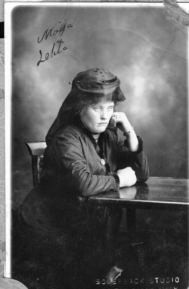 Maija Latvala (Keskinen/Lehto). Kuva otettu ensimmäisen miehen Keskisen kuoleman jälkeen Amerikassa lähetettäväksi sukulaisille Lapualle.
