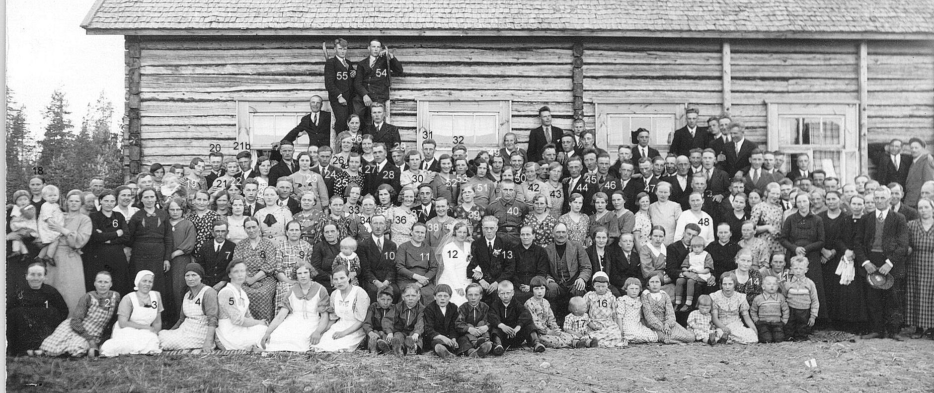 1 = Hilda Pohjasmäki, 3= Olga Hakala, 4 = Sanna Autio, 5 = ? Ojala, 6 = Fiia Luoma, 7 = Mäenpää Aleksanteri, 8 = Eveliina Mäenpää (os. Pöntiskoski), 9 = Liisa Kamppila (os. Pohjasmäki), 10 = Matti Pohjasmäki, 11 = Kaisa Pohjasmäki, 12 = Liisa Hautamäki (os. Pohjasmäki), 13 = Eino Hautamäki, 14 = Esteri Kankaanpää, 15 = Sanna-Liisa Haapa-Aho (os. Mikkola), 16 = Maija Lehtoniemi ( os. Haapa-Aho), 17 = Sisko Panula (os. Haapa-Aho), 18 = Sanna Koliini, 19 = Maija Pohjasmäki (os. Pihlajamäki), 20 = Viljo Pohjasmäki, 21 = Etna Kuusela, 21b = Heikki Kuusela, 22 = Ellen Kuisti (os. Autio), 23 = Emma Ojala, 24 = Niilo Orava, 25 = Laimi Kankaanpää, 26 = Vieno Kangastie, 27 = Bertta Ahonen, 28 = ? Nappolakso, 29 = Jussi Kalliokoski, 30 = Jenny Kankaanpää (os. Haapa-Aho), 31 = Jussi Saarela, 32 = Jussi Sauna-Aho, 33 = Martta Saarimaa (os. Rintala), 34 = Maija Hauta-Aho (os. Pohjasmäki), 35 = Aili Rintala (os. Pohjasmäki), 36 = Eini Kamppila (os. Pohjasmäki), 37 = Eino Kamppila, 38 = Annu Hautamäki (os. Pohjasmäki), 39 = Ellen Hautamäki, 40 = Vilho Hautamäki, 41 = Hilma Nappulakso, 42 = Liisa Harju (os. Luoma), 43 = Taimi Metsäpelto (os. Haapa-Aho), 44 = Sulo Metsäpelto, 45 = Eino Sauna-Aho, 46 = Sulo Koskela, 47 = Ilmari Peltonen, 48 = Sanni Kotala ( os. Kivisaari), 49 = Laina Aho (os. Saarela), 50 = Paavo Rintala, 51 = Elviira Rinta-Aho, 52 = Kotala (m. Aho), 53 = Maija Aho, 54 = Eino Hietala, 55 = Veikko Mäenpää, 56 = Lyydia Salmenkangas