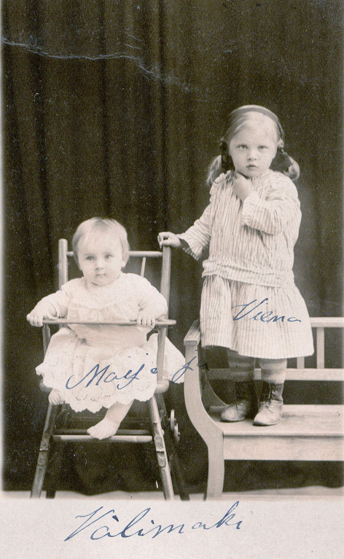 Maija ja Vieno Välimäki. Tytöt ovat isuni Kaisan (-93) isän Matin (-10) siskon Sannaliisan (-34, I -aviossa Juho Mäenpään kanssa) pojan Matiaksen (-54) lapsia. Sanna-Liisa oli II -aviossa Vihtori Lahon kanssa. Tästä avioliitosta lapset Juho Arvid (-62) ja Aili (-82).