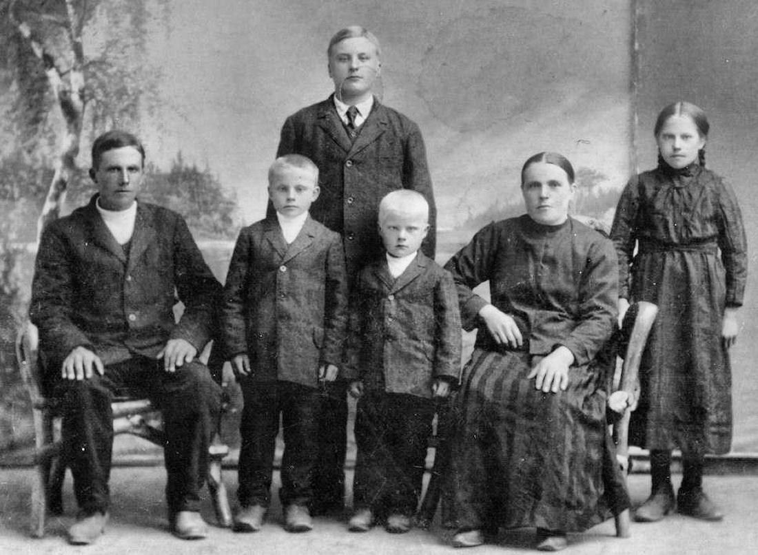 Juha (Johan) Järvenpään (aiemmin Kotala, -60) ja Wilhelmiinan (os.Aho, -44) perhe. Lapset vas. Lauri (-83), Juho ('Jussi', takana, -21), Aukusti (-76) ja oikealla Maria (-18). Juha oli isoisäni isän Heikin veli. Wilhelmiinan sisar Sanna Liisa (-32) oli naimisissa Vanhanmäen Matin (-10) kanssa. Matti oli isoisäni Jussin äidin veli. Matin ja Sanna Liisan avioliitosta jatkoi sukua Martta (m. Saarimaa)