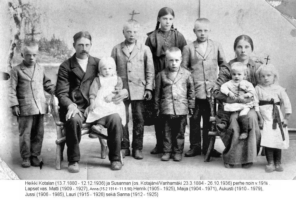 Isäni Eeron isän Jussin isä Heikki perheineen! Perheen koti oli nykyisen Kotalan Harrin talon kohdalla. Nimet alla.