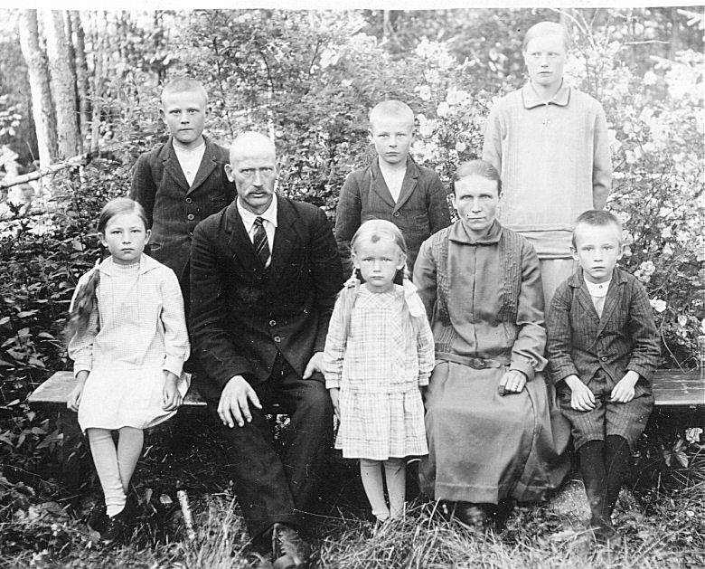 Isoisäni Jussin veljen Veikko Kotalan vaimon Martan (os. Kivimäki) perhettä Tiisijärven Pökästä. Martta istuu penkin päässä vasemmalla.