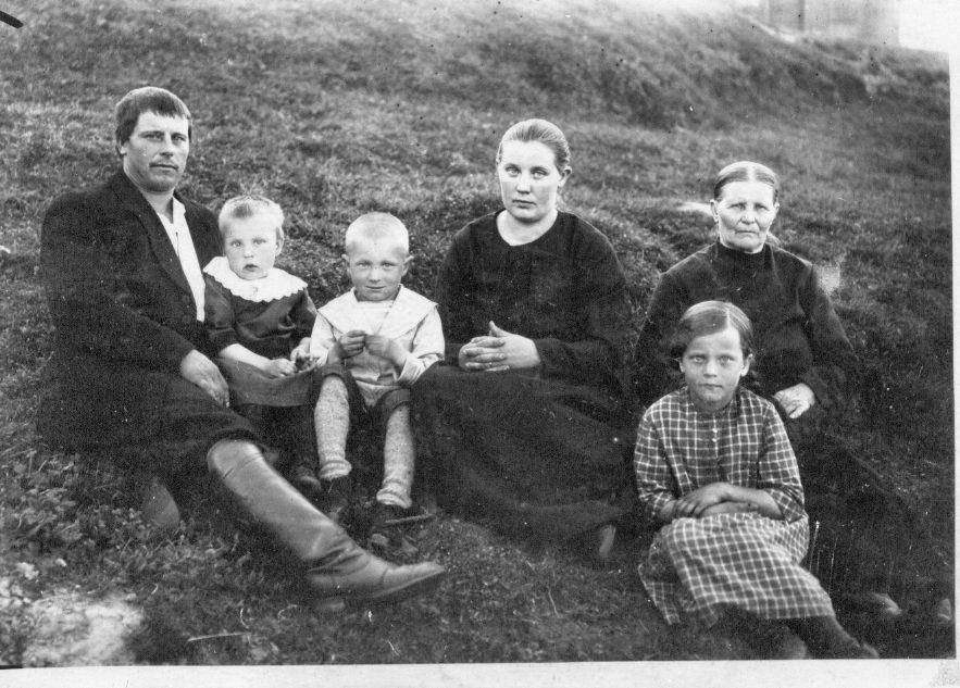 Hermanni ja Sanna Perämäen (os. Venesoja) perhekuva. Lapset vas. Aili, Eeli, Jenny (m. Välimäki), mumma oikealla Hermannin äiti Fiia