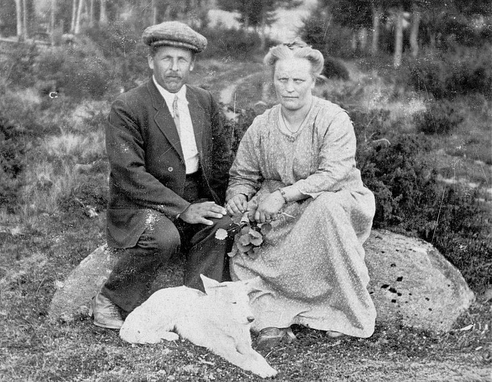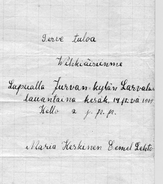 Eemi ja Maija Lehto (os. Latvala, Aukustin sisar). Kuvan alapuolella Eemin ja Maijan hääkutsu. Kutsussa Maijan sukunimi Keskinen on hänen ensimmäisestä avioliitostaan. Puoliso kuoli heidän ollessaan Amerikassa. Kuva otettu v. kesällä 1924