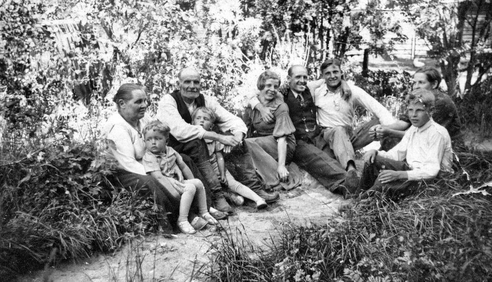 Miinan ja Esa Murtomäen perheidylliä ennen sotia. Vas. Miina ja Esa (sylissä Jalon pojat Antti ja Matti), Sylvi, Jalo, Eero, Jussi sekä Jussin takana Kyllikki.