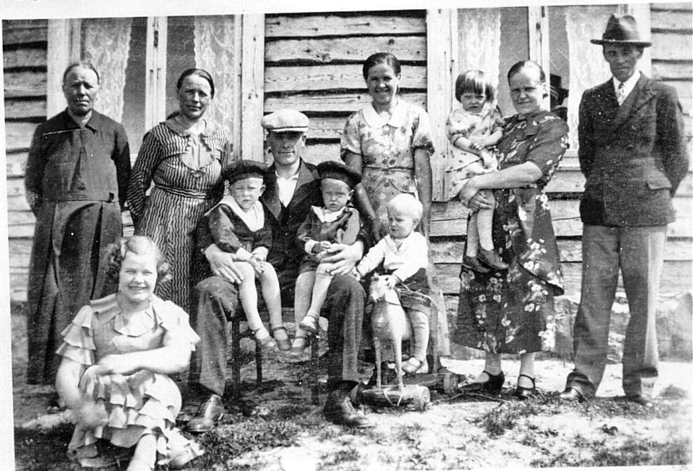 Istumassa lapset sylissäänVihtori Mäenpää ('Kujala'), hänestä oikealle vmo Laina (os. Haavisto, Ylikylästä), lapset vas. Aatto, Alpo, Aarre. Vasemmalla oleva mumma on Vihtorin äiti, hänestä oikealle Iita Mäenpää (Vihtorin sisar, 'Seksin' Matin (oik. Ketola) II -vmo., Matti oli vankilassa oppinut vaatturin ammatin, hänen äitinsä oli Rantavaaran Lempin ja Harjun Liisan siskopuoli), etualalla kyykyssä Martta (m. Laurila, Vihtorin sisar), oikealla olevasta pariskunnasta ei tietoa