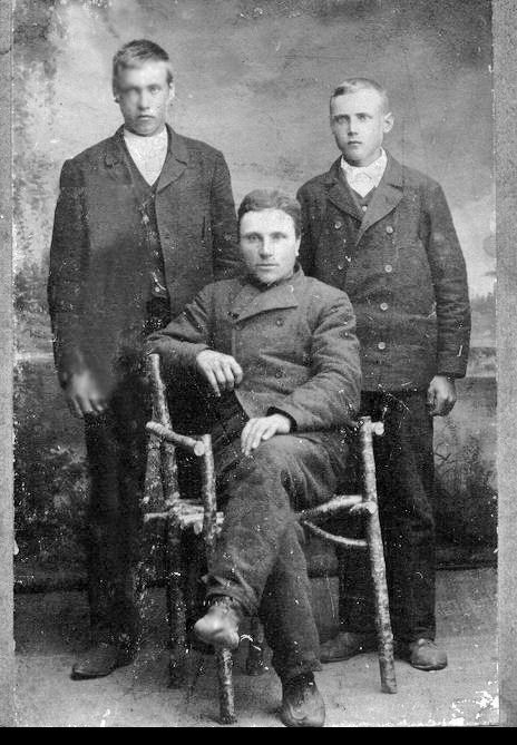 Vas. Juha Välimäki (isuni Kaisa Kotalan (-93) isän Matin (-10) vanhimman veljen Jaakon (k. 1895) poika (-33). Istumassa tod. näk. Liisa Katteluksen (m. Hietala) ensimmäinen mies Juho (-10, ns. 'Murto-ukon' l. Matti Murtomäen pka, Ylikojolan Liisan ja Murtomäen Sanna-Kaisan isä), oikealla Heikki Murtomäki ('isä-Kaapoon vanhin poika, kuoli kansalaissodassa, vmo. Maija oli Juhan sisar). Juhon isä 'Murto-ukko' tuli samoihin aikoihin torppariksi Murtomäelle Heikin isänisän (oik. Kivistö) kanssa 1800 -luvun puolenvälin jälkeen. Murto-ukko rakensi Hietalan taakse sittemmin tuulimyllyn. Kovassa myrskyssä tuulimyllyn siivet (pinta päreistä) olivat lopuksi lentäneet Tullinmäkeen saakka kerrotaan. 'Muurari-Matti' (Juha Välimäen veli) rakensi myllyn hirsikehikosta itselleen tuvan. Korpelanmäellä oli toinen tuulimylly jota Juha Välimäki hoiti, senvuoksi häntä kutsuttiin 'Myllymäen Jussiksi'.