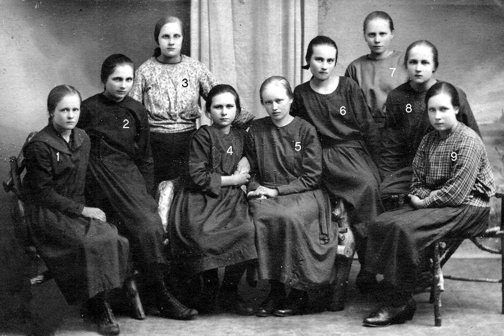 1 = Impi Hietaranta (m. Mikkilä), 2 = Martta Hernehuhta (m. Välimäki), 3 = Saima Latvala (m. Panula), 4 = ?, 5 = Martta Siltala (yks.), 6 = Kaisa Välimäki (?), 7 = Martta Kotala, 8 = ?, 9 = Martta Kallio (Hermannin sisar). Kuva otettu v. 1925