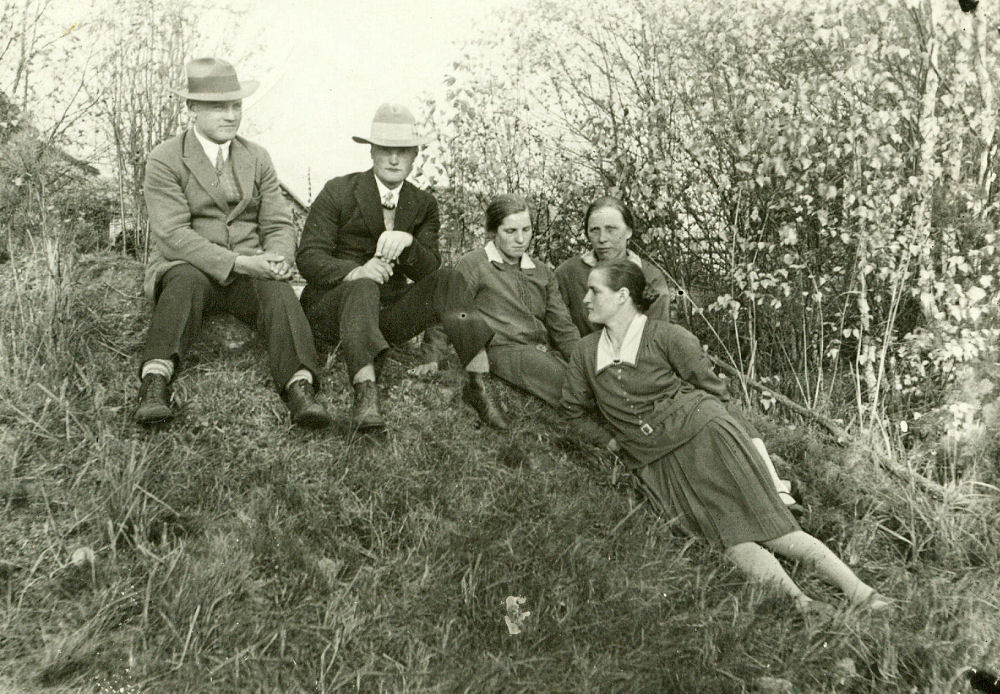 Vas. Matti Välimäki (kaatui), Vihtori Murtomäki (edellisenä iltana Vihtori oli olllut Hirvijoen nuorisoseuran tansseissa järjestysmiehenä, Hirvelän Lauri oli päässyt lyömään puukolla oikeaan peukaloon, piilottelee sitä), Kyllikki Murtomäki (m. Kuikka), Maija Luostari (taempana, oli 'poika-Kaapon' tuvalla piikana), Sanna-Maija Murtomäki (Välimäki/Koivisto)