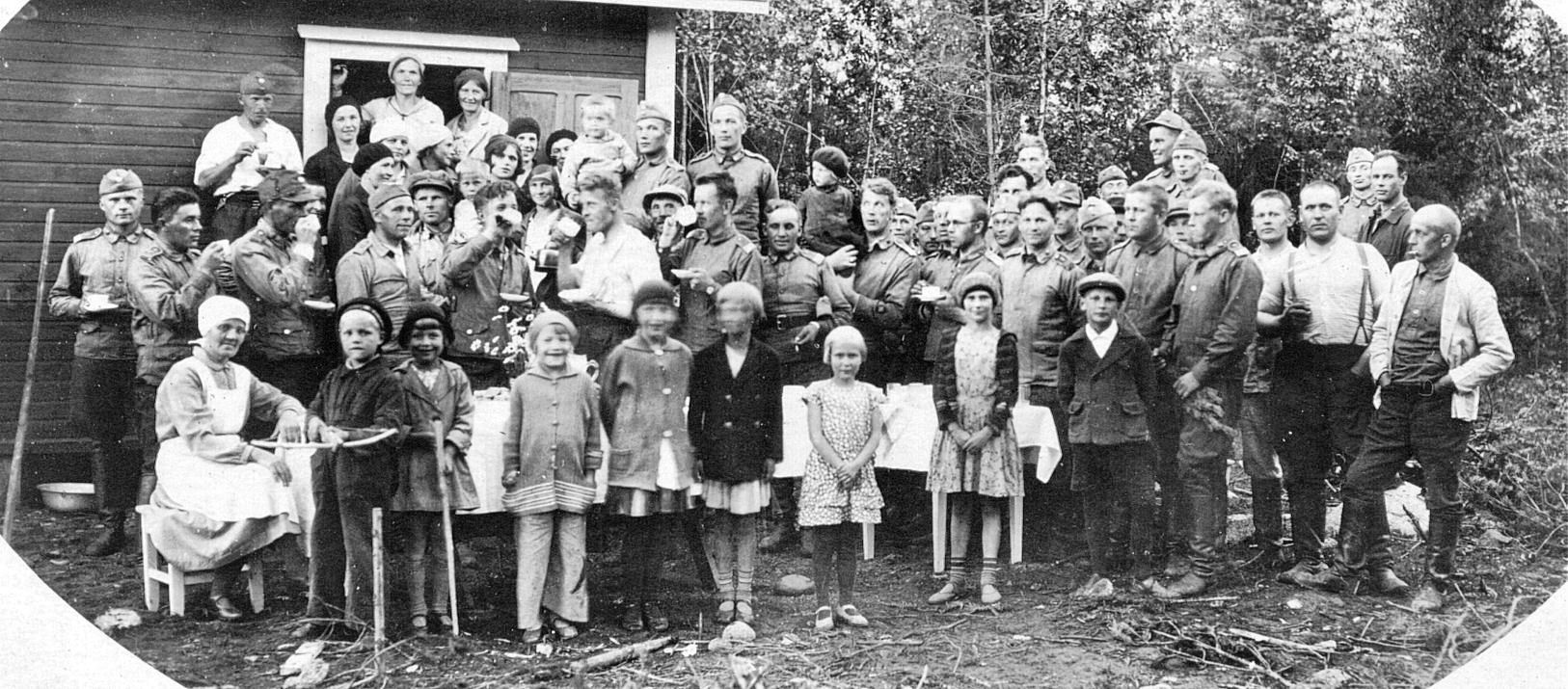 Vas. Aukusti Järvenpää kahvikuppi kädessä. Kuvassa pitäisi olla muitakin Hirvijokisia