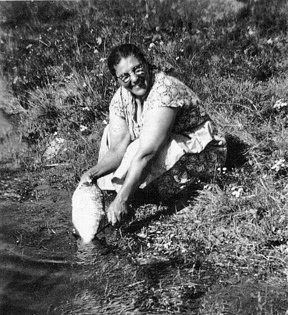Maija Hakamaa perkaamassa miehensä Kallen onkimaa lahnaa. Kalle onki keväisin Lakaluomasta kaloja ja myi niitä mm. Ylikylään