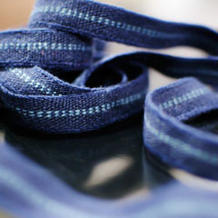 Taskua kiinnittämässä on vyötärölle solmittava sinisävyinen pirtanauha.